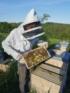 Mit den Bienen fing alles an. Mit viel Bedacht und Vorsicht dürfen wir jedes Jahr eine kleine Menge Honig von „unseren Damen“ ernten, die mit ihren Stöcken in den Wiesen und Wäldern des Schweinebergs wohnen. Den Honig gibt es auf Bestellung und beim Marktverkauf solange der Vorrat reicht.